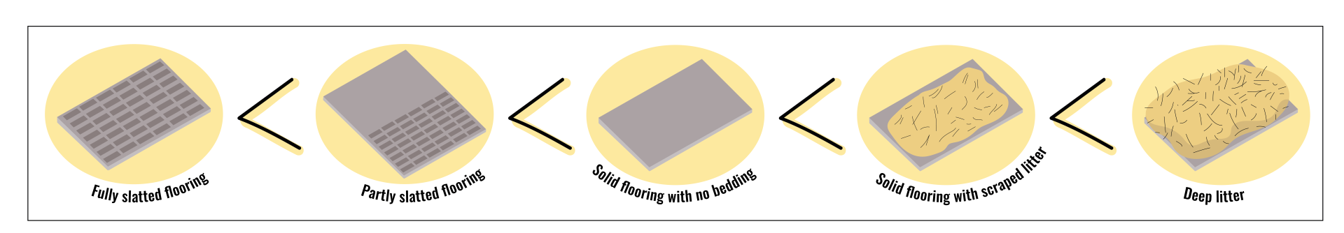- The welfare of pigs increases according to the type of flooring, following a gradient (fully slatted flooring < partly slatted flooring < solid flooring < deep litter), which is associated with the amount of straw provided.