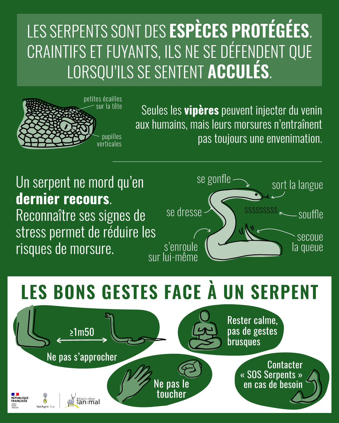 Seules les vipères, en raison de leur venin, représentent un risque potentiel, mais celui-ci est fortement limité en respectant deux règles simples : ne pas s’approcher à moins d’un mètre ni chercher à saisir le serpent à pleine main, et adopter les bons réflexes en cas de morsure.