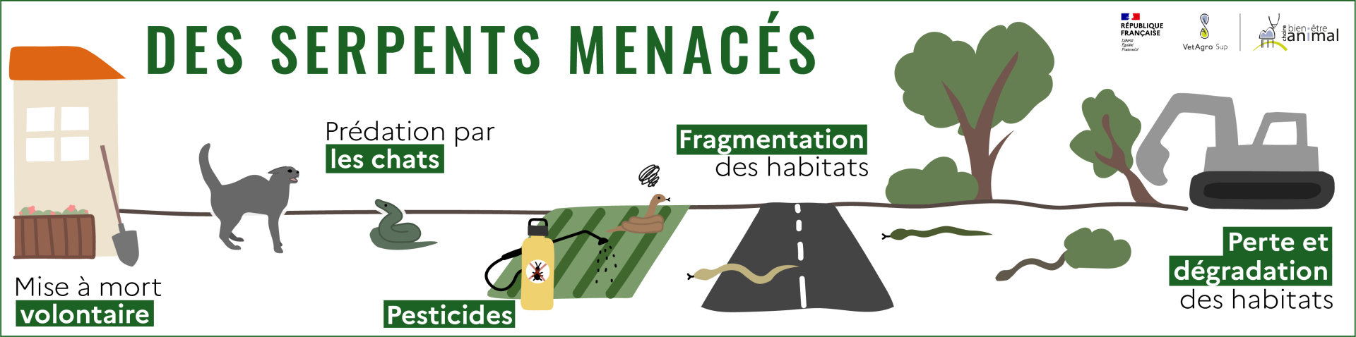 Cette baisse s’explique principalement par la perte et la dégradation de leurs habitats, notamment des milieux ouverts ou des lisières de forêt, du fait de l’intensification de l’agriculture, de l’urbanisation et du développement d’infrastructures humaines[7]. Ces changements entraînent aussi une fragmentation des habitats et une diminution de la continuité écologique, accentuée par la présence de routes. La dégradation de leurs habitats limite leur accès à des zones de chasse, de repos et de reproduction, compromettant directement leur bien-être et leur survie. Les pesticides peuvent aussi se retrouver dans les proies consommées par les serpents et avoir un impact indirect en influençant négativement leurs capacités reproductives.