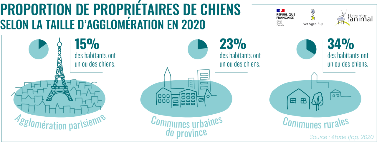 D’après une enquête IFOP menée en 2020, un quart des Français déclarait posséder un chien. Cette proportion reste significative au sein des grandes agglomérations : 15 % des habitants de l’agglomération parisienne et 23 % des habitants des autres communautés urbaines françaises affirmaient être propriétaires d’un chien. Ainsi, la présence des chiens n’est pas limitée aux zones rurales[1].