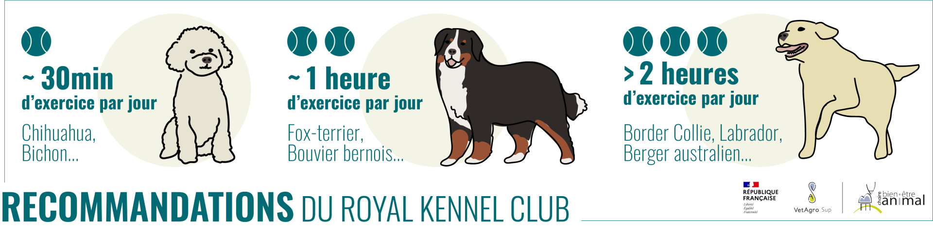 Le Royal Kennel Club (Club canin officiel du Royaume-Uni) propose ainsi des recommandations de temps d’exercice en fonction des races, selon trois grandes catégories :