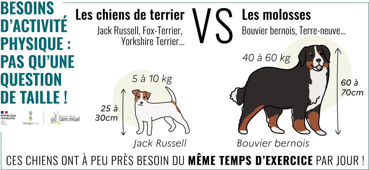 Les besoins en exercice physique dépendent de chaque individu et varient selon la race et l’âge du chien. Il n’existe pas de consensus scientifique précis sur la fréquence ou la durée idéale d’activité physique nécessaire pour les chiens. Des recommandations générales sont parfois proposées pour certaines races, mais elles ne tiennent pas compte des différences individuelles qui existent au sein d’une même race et reposent davantage sur les connaissances d’experts des races plutôt que sur des données scientifiques[5]. Ces recommandations ne sont pas toujours applicables à des chiens croisés, pour lesquels il n’est pas possible de s’appuyer sur la race pour connaître leurs besoins de dépense physique.