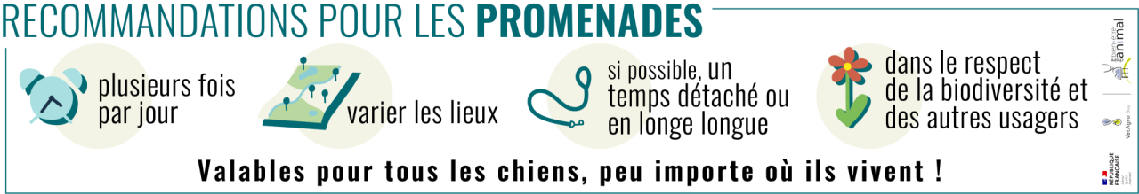 Il est important de promener son chien plusieurs fois par jour (sauf contre-indication vétérinaire), de varier les lieux pour lui permettre de découvrir de nouvelles odeurs et d’explorer de nouveaux endroits. Ces promenades sont à la fois importantes pour les chiens vivant en appartement mais aussi pour les chiens vivant dans un jardin qui doivent également exprimer leur besoin d’exploration.