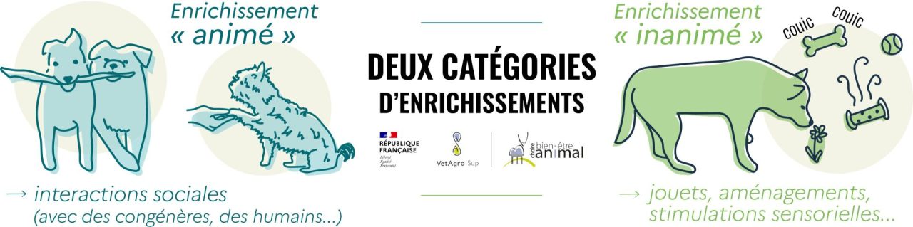 Pour favoriser le bien-être d’un chien, il est possible de proposer différents types d’enrichissements à son environnement. On distingue deux grandes catégories :