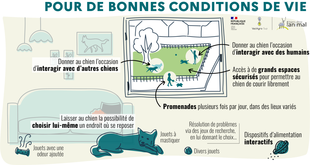 - Des aménagements permettent de garantir le bien-être d’un chien : effectuer des promenades plusieurs fois par jour dans des lieux variés, aménager un espace calme et proposer des enrichissements « animés » et « inanimés ».