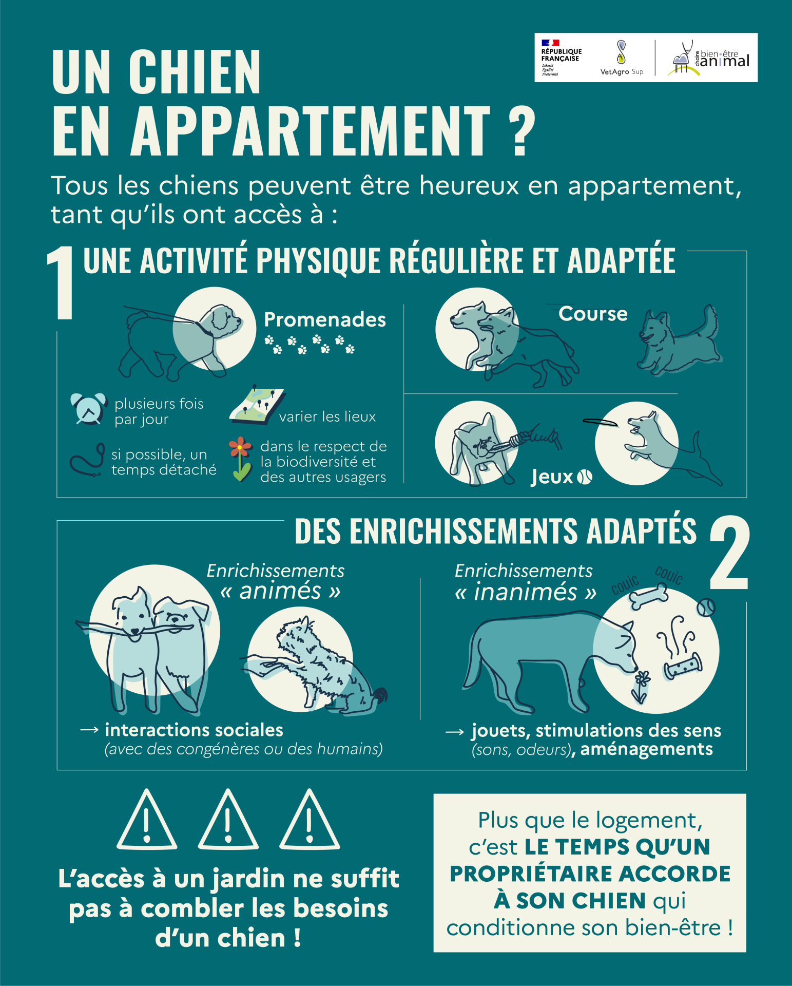 Un chien peut tout à fait être en situation de bien-être en vivant en appartement ou dans une maison sans extérieur. Il a toutefois des besoins physiologiques et comportementaux qu’il est nécessaire de combler pour son bien-être. Ceux-ci doivent être satisfaits, que le chien vive dans un jardin ou en appartement. La vie en appartement n’est pas incompatible avec les besoins du chien, mais elle demande au propriétaire du temps, de l’attention et un réel investissement pour garantir les meilleures conditions de vie possibles à son compagnon.
